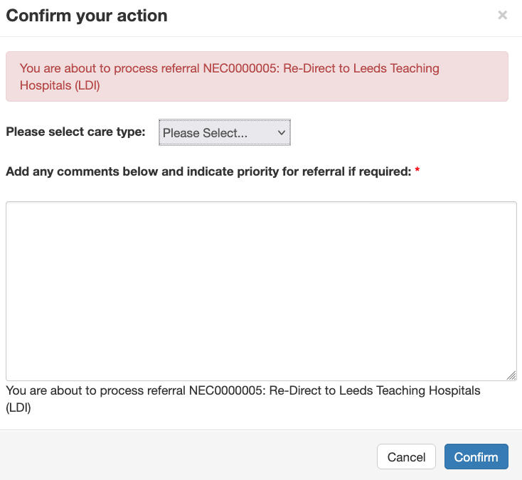 The Blue return to referral centre option also has a comments box which the admin team will action based on your wishes. NOTE: This is not used to escalate the referral to secondary care